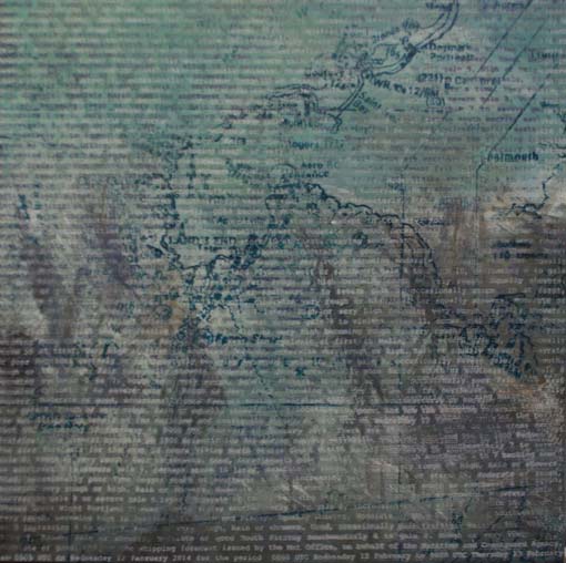 The works are inspired by the rhythm and beauty of the words, the general synopsis of sea area forecasts and coastal stations. The words are unique and so distinctive. Someone, somewhere in the world depends on them. In the choral work of Cecilia McDowall they sound like poetry, in a written form they can be seen more carefully with patterns evolving in them. Spoken or sung they have their own rhythm, written they are visual poetry. In the paintings they are words not to be read in the conventional way but words to draw you into the picture, layers of textures fading in and out of the painted surface. They read like snippets of conversation. The ideas came to me after looking at a series of videos by Sam Taylor Wood in which the viewer can’t quite make out the conversations in a room but occasionally hear odd words every now and again.