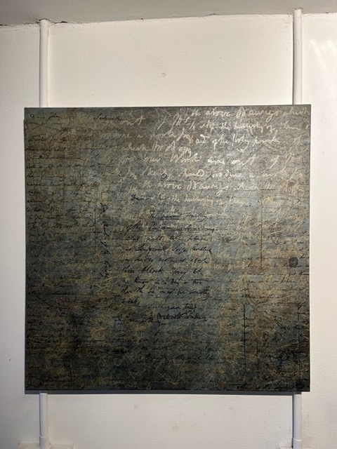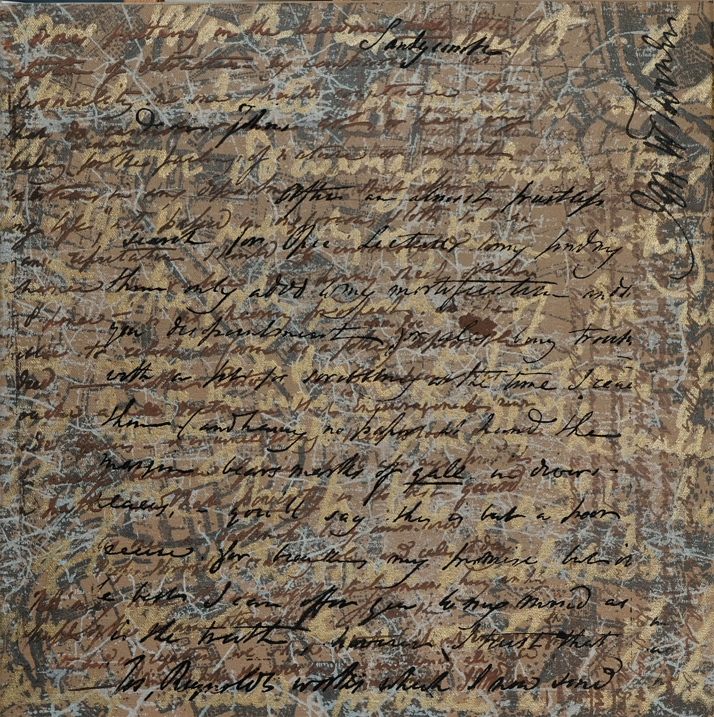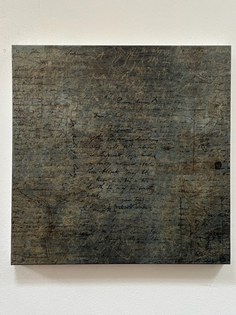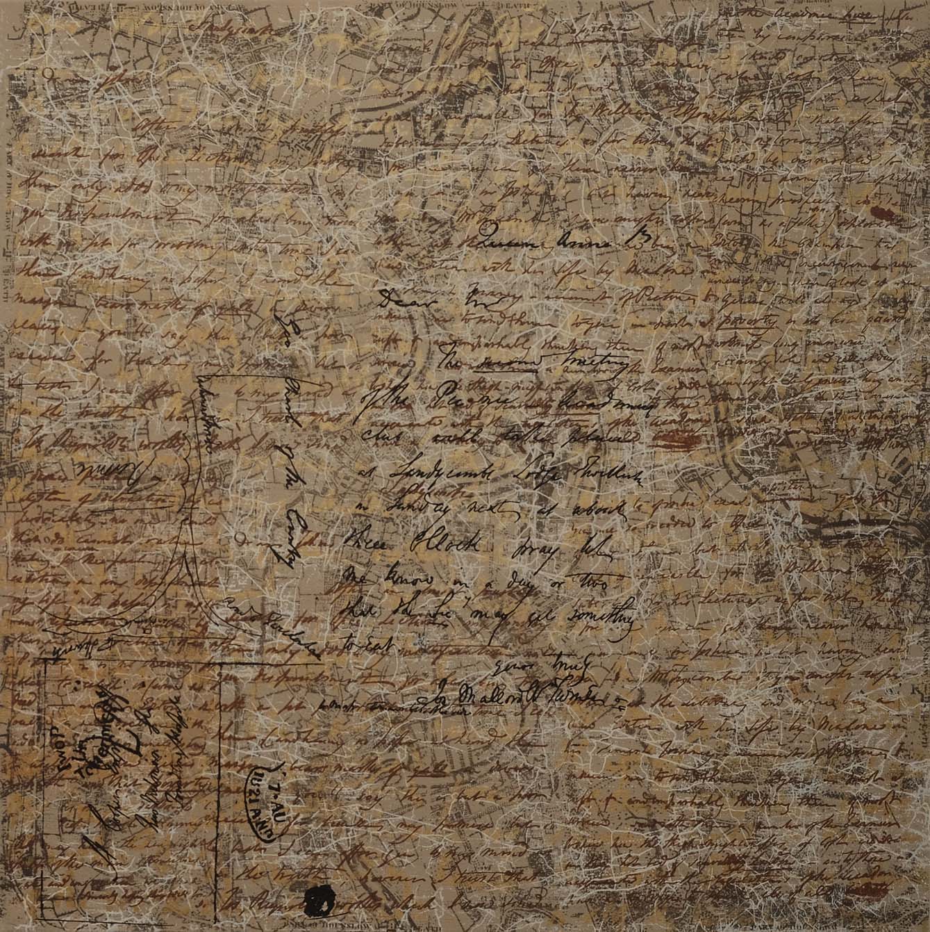 My preliminary sketches were digital to see how the handwriting worked with the maps of this area. I’ve also enlarged sections of his writings and transferred them onto silk screens for printing into both small and large canvases. Some are just textures of overlaying layers of different writings. Others are printed onto pages of 19th century poets and writers, while others are on music scores and maps of where he lived and worked in London.