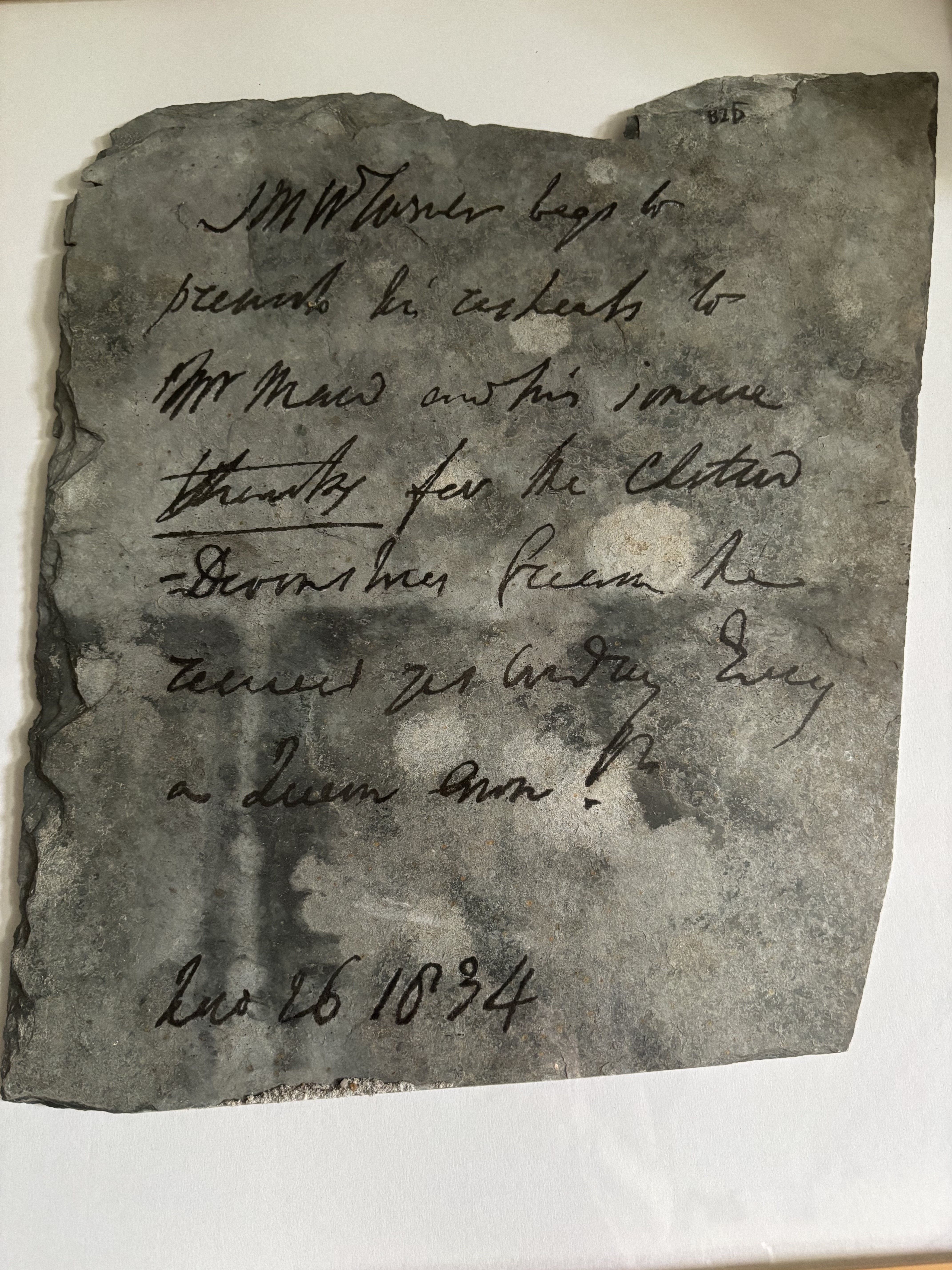 This year is the 250th anniversary of Turner’s birth. Recently I have been helping to organise an exhibition at Cotehele (where he visited in 1811), of the work of local artists of the Tamar Valley who have been inspired by his works. I will be exhibiting a number of my own works using Turner’s handwriting, including one where I printed directly onto slate, which was contemporary and in use, when he visited this area of the South West. He thanks a friend for sending him some clotted Devonshire cream, quite apt I thought!