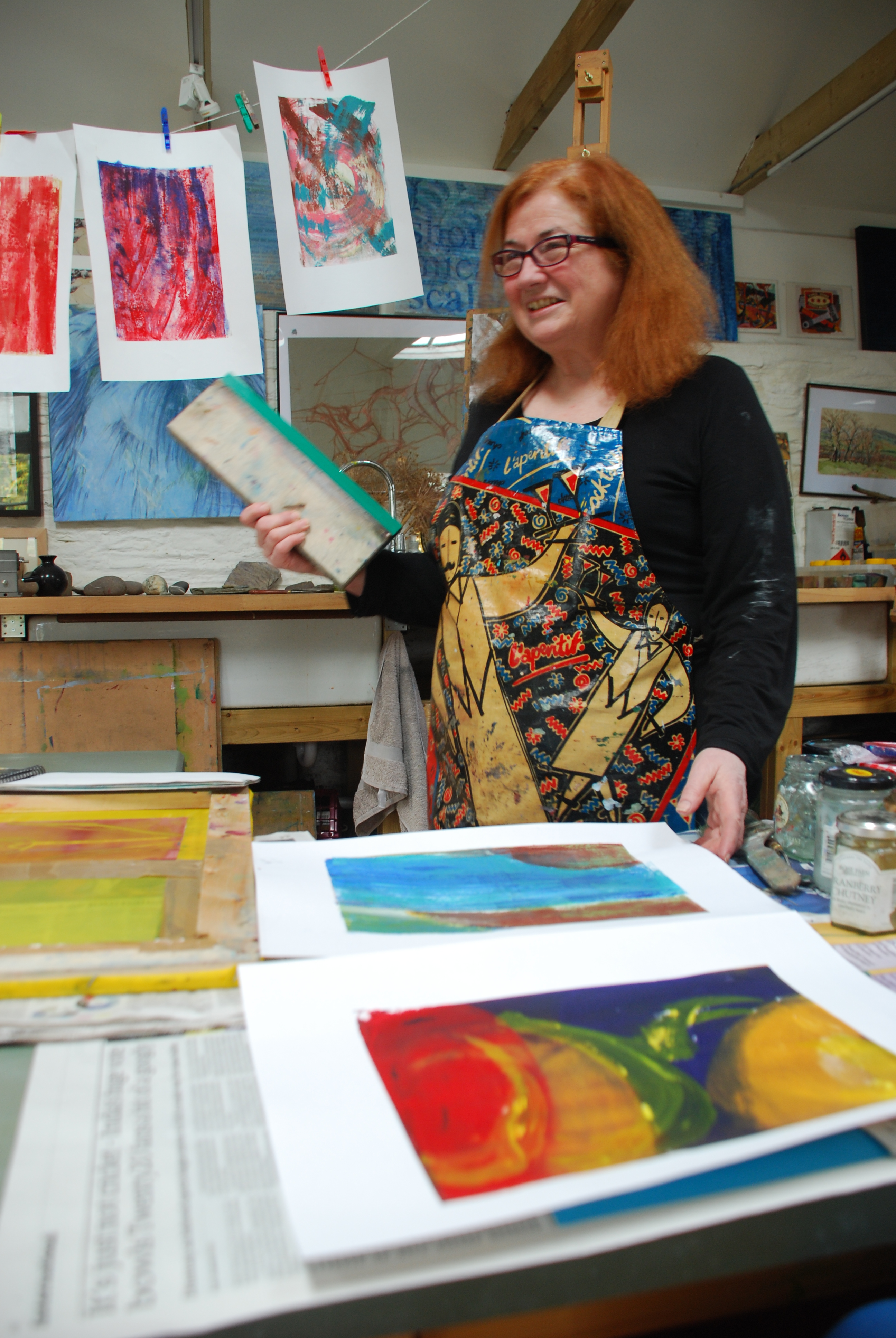 ‘I was lucky enough to win your magazine’s competition of a week’s course at Callington School of Art in Cornwall. I chose a course in mixed media which I attended over the Easter break from my London Foundation in Fine Arts course at Mary Ward in London. I thought the readers would be delighted to hear about this as it turned out to be a wonderful prize. Callington Art School is a charming traditional Cornish building which incorporates a guest house and spacious studio for painting as well as printing and photography. I had full board in a double room with ensuite. The establishment is run by Tessa and Peter Sulston, a warm-hearted and entertaining couple who are living their dream. Tessa was an art tutor in Oxford previously and she has found a way to continue her art practice as well as teaching her students the traditional skills of drawing, painting, printing and photography. Peter runs the guest house, admin, driving and most importantly the cooking. We were given three meals a day and every dish was a picture in its own right and delicious. The course took place in the studio which was hung with work from several generations of Tessa’s family – brilliant portraits and photographs and paintings of the Cornish landscape from traditional to more modern interpretations. I received in depth tuition in charcoal drawing, watercolour and my favourite of silk screen printing. We were taken to the coast to gather material for our work – photos, drawings in our sketch books, rocks, shells, sea weed etc. I was encouraged to keep returning to my charcoal drawing and it certainly improved especially seeing new aspects as I went along. I had fun with some watercolour and received more tuition in the art of really noticing. Tessa soon spotted that I would like the silk screen where I could use my love of colour and a more abstract approach. Peter made me a silk screen so I could continue on my return to London. I attach a photo of me admiring my work with pleasure at the end of a very fulfilling week.’